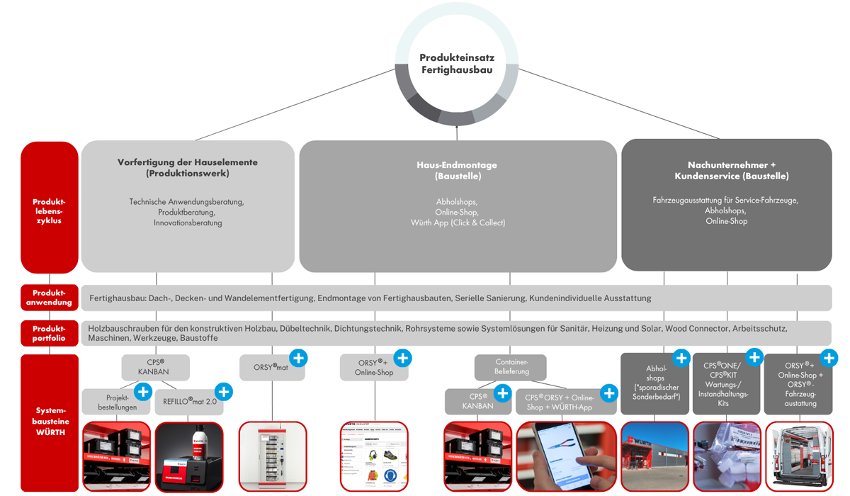 Mit unserem Produkt- und Serviceportfolio für den Fertighausbau erhalten Sie einen zuverlässigen Partner, dessen Angebot von Holzbauschrauben, Dübel- und Dichtungstechnik bis hin zu Arbeitsschutz, Maschinen, Werkzeugen und Baustoffen reicht. Ergänzt wird dies durch innovative Systeme zur Materialbeschaffung, wie unserem ORSY®mat oder RFID Kanban , die Prozesse in Produktion und Montage automatisieren und dezentralisieren. Ob für die Vorfertigung von Bauelementen, für die Endmontage auf der Baustelle oder für die nachträgliche Wartung – wir haben die passenden Lösungen für Sie.