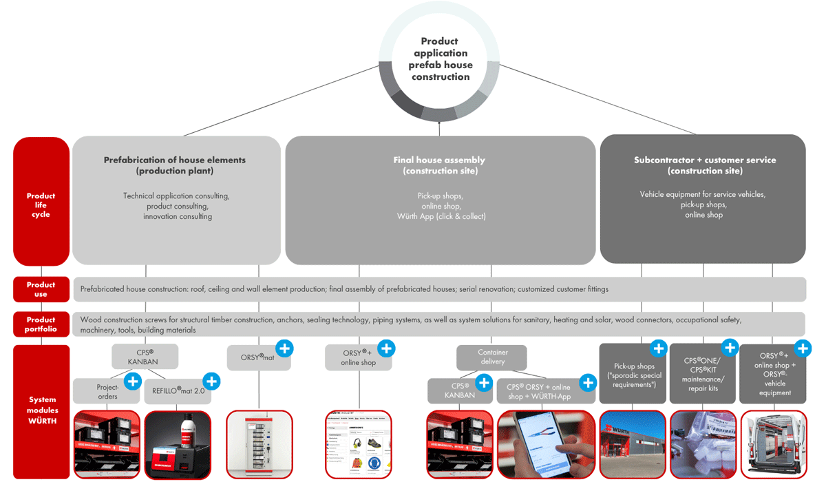 With our product and service portfolio for prefabricated house construction, you get a reliable partner whose offerings range from timber construction screws, dowel and sealing technology, to occupational safety, machines, tools, and building materials. This is complemented by innovative systems for material procurement, such as our ORSY®mat or RFID Kanban , which automate and decentralise processes in production and assembly. Whether for prefabrication of building elements, for final assembly at the construction site, or for subsequent maintenance – we have the right solutions for you.